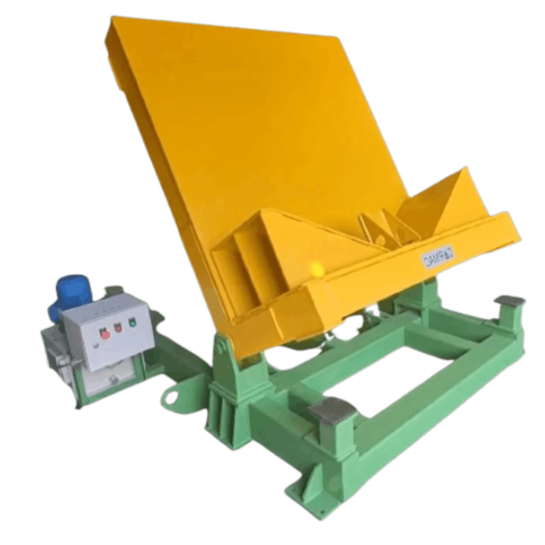 The in-house designed and manufactured Coil Tilter / Upender is a small footprint upender for tilting coils of steel or any fabricated part from a vertical to a horizontal bore position enabling safe loading to an Uncoiler machine. It is mechanically driven and can be stopped with the load held at any point in the turning process. It has a round cradle type frame, made up of welded steel, i.e. placed on four machined rollers and a gear motor driving a chain sprocket provides the ability to rotate. Sealed bearings help the rollers support the load. A brake motor and gear reducer drive a sprocket to give a smooth rotating cycle (Jerking or sudden speed changes could unbalance the load). The unit is wired to operate on your available power supply and comes complete with electronic controls and a safety disconnect switch and a push button station mounted on the unit. This machine is robust, easily maintained and reliable with high quality Indian-sourced componentry. Our 5 ton model is standard and we can also manufacture to suit the tonnage required. Available in both electrically and hydraulically operated models.